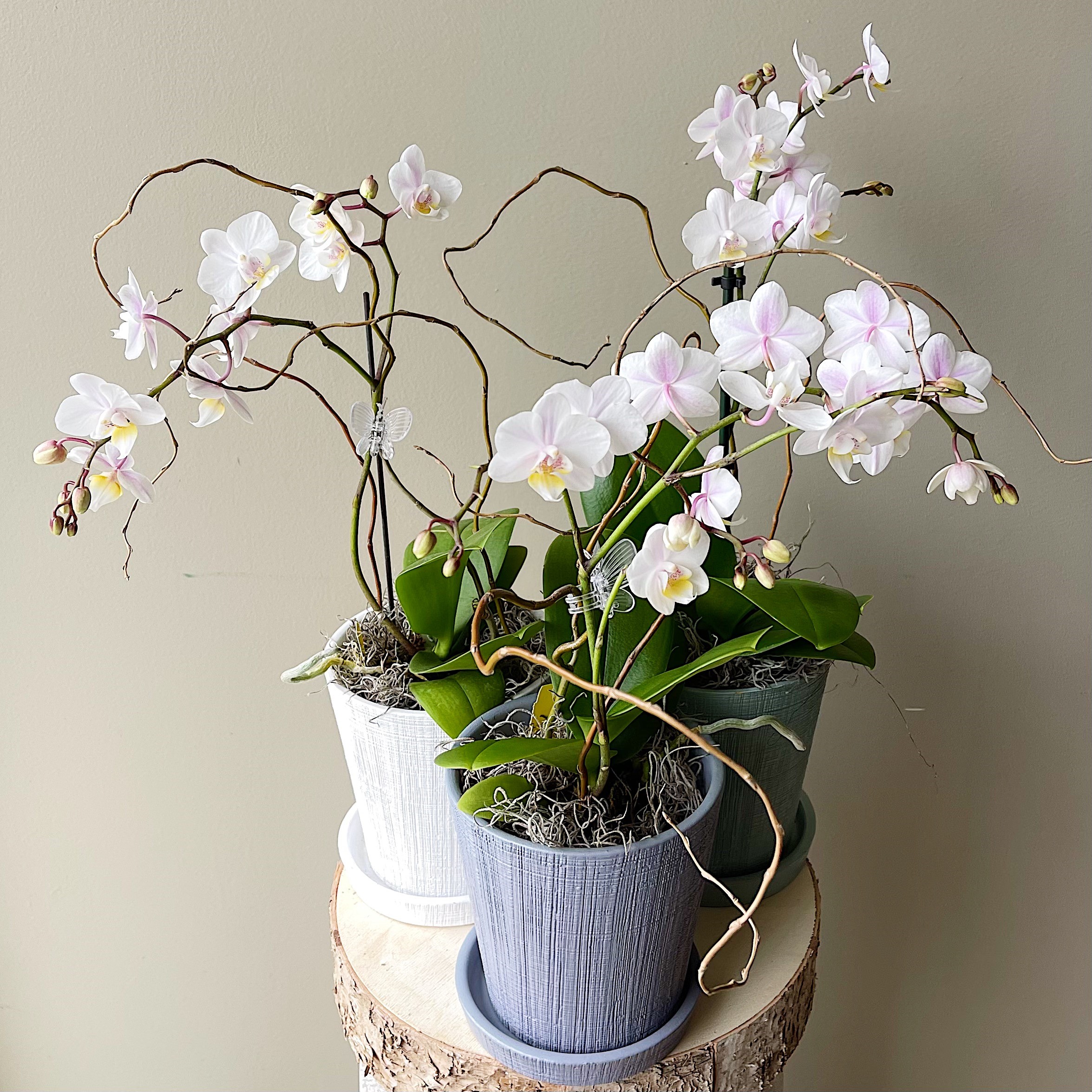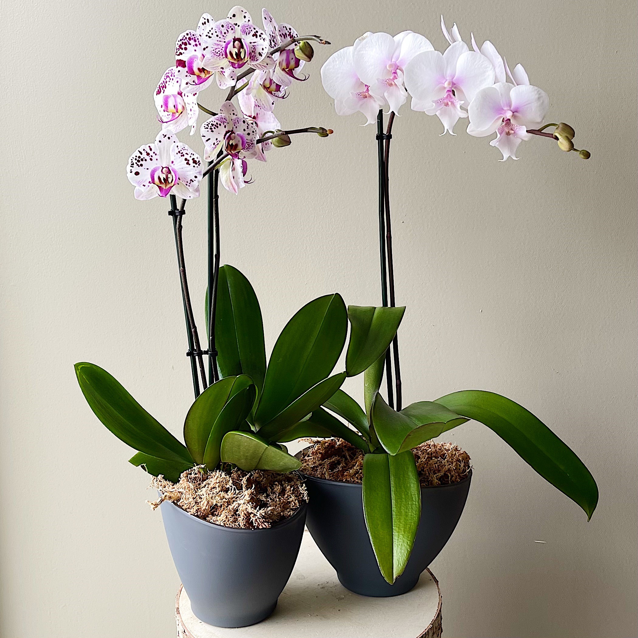 This long-lasting blooming beauty will bring a smile to anyone's face. A Phalaenopsis, or moth orchid, in a charming ceramic pot makes this a classic gift with high style. The miniature orchids are shown in a textured ceramic pot, the full-size is shown in a blue boat-shaped ceramic pot. Color of pot and orchid will vary.