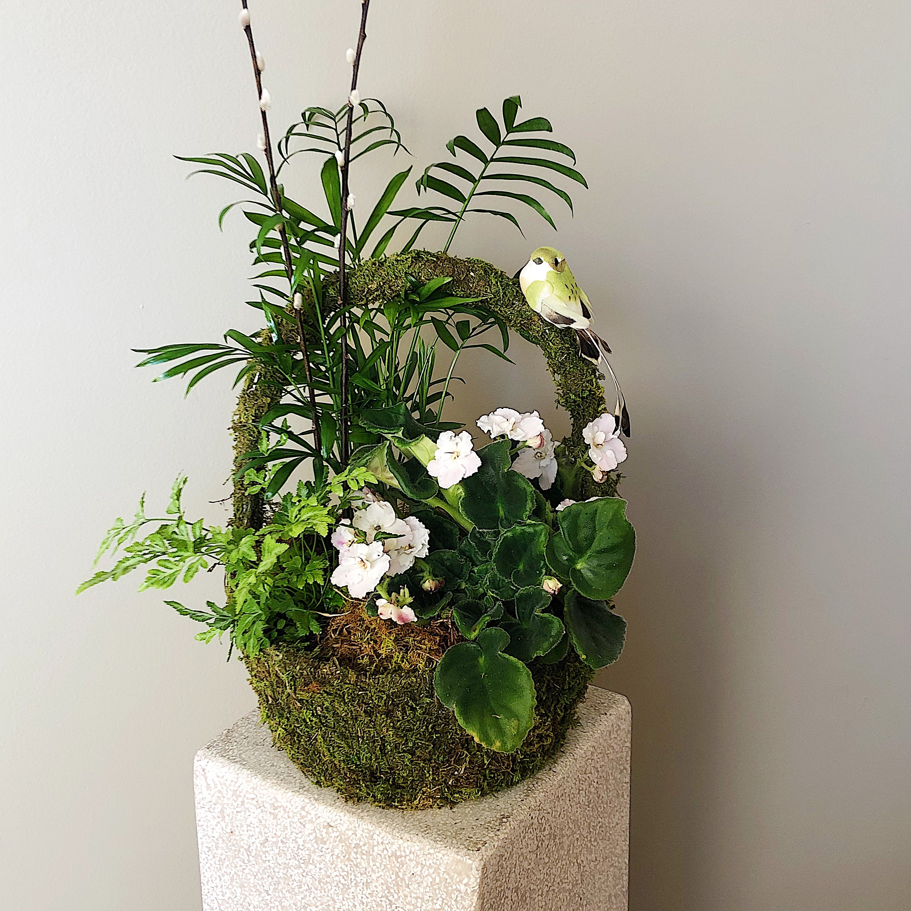 A beautiful spring songbird sits atop the handle of a mossy green basket. Filled with an assortment of green and blooming plants, this lovely dish garden will bring the spirit of spring to any home or office. Colors will vary. Bird variety may vary. This item is a Forth Exclusive and is not available for delivery outside of our delivery area.